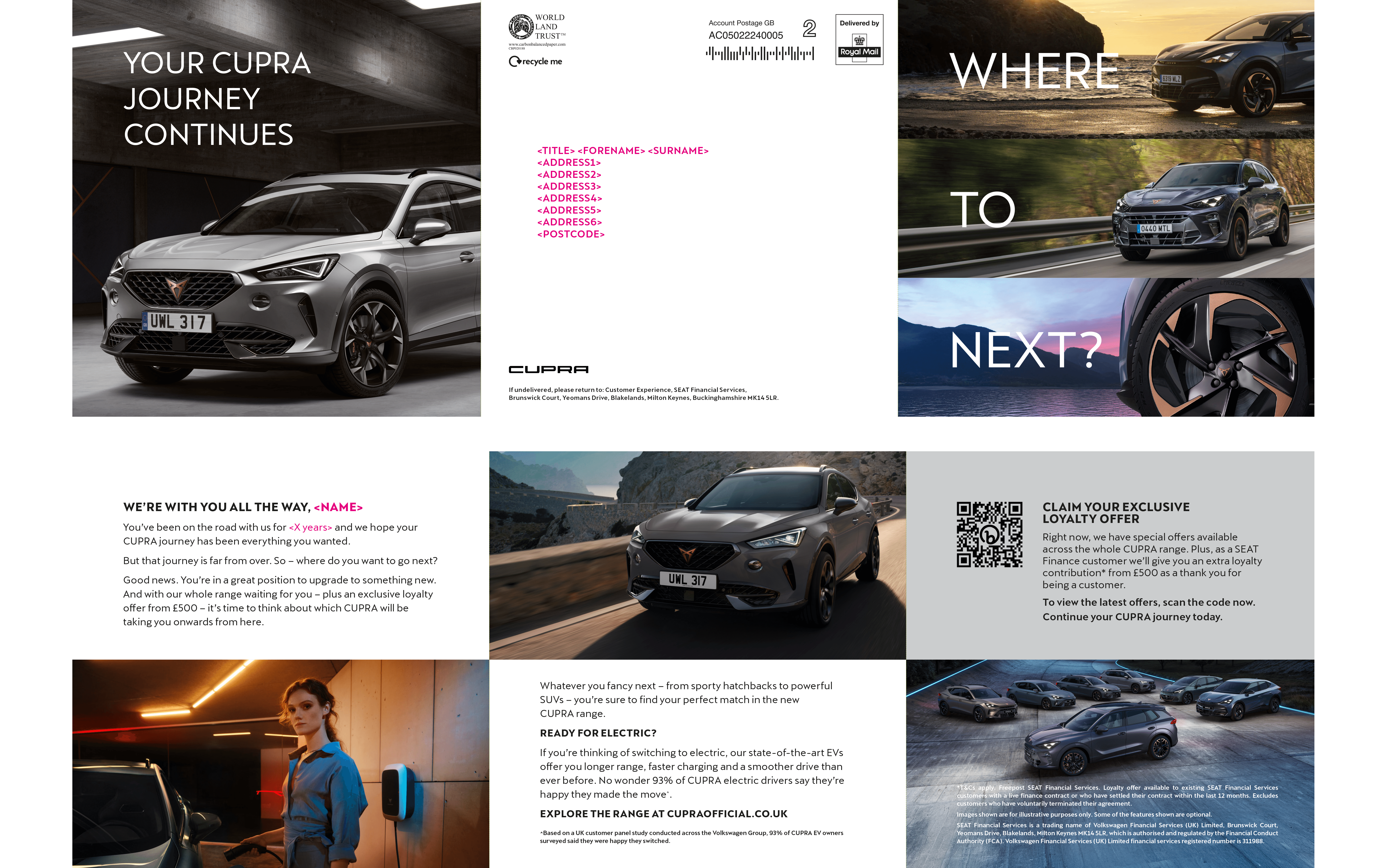 I created a flexible design framework that allowed each brand to shine through unique typography and color palettes while utilizing a shared structural logic. From the rugged, utility-focused layouts of VW Commercial to the sharp, high-performance aesthetic of CUPRA, the goal was to guide the customer through the 'Where to next?' journey, encouraging service bookings, upgrades, and brand loyalty.